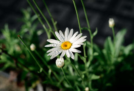 daisies on a dark, grain background. Flowers with white petals with a yellow center on a green stem. Dark background Summer is a wonderful time of the year. Field of daisies.