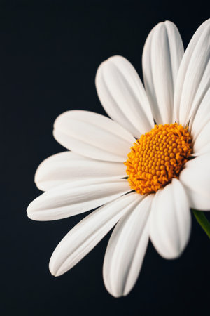 A single daisy flower is centered against a stark, black backdrop. The white petals are detailed, showing texture and small water droplets. The yellow center provides vibrant contrast. The composition uses high contrast, with potential uses in nature, beauty, or decorative projects.
