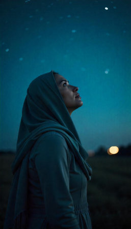 Beautiful Muslim woman in hijab standing on the beach at sunset.