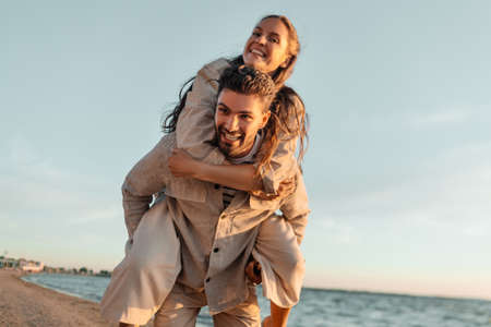 The girl hugs the guy from behind. The embrace of a couple in love on the seashore.