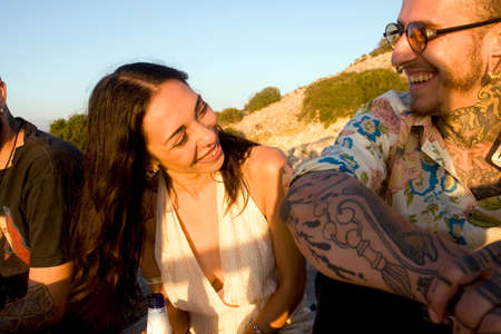 Picture of romantic young couple hugging on skylight and waves. Bright sunshine. Side view
