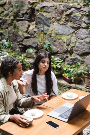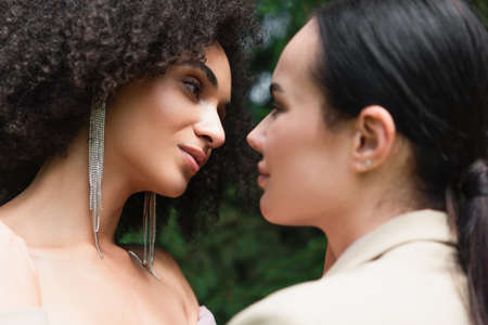 African american woman looking at blurred lesbian girlfriend in suit outdoors
