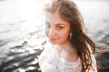 Pretty lady, bride posing in a wedding dress near sea on sunset