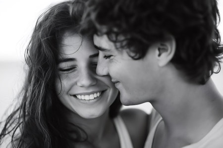 Romantic black and white portrait of a young couple embracing with tender smiles and closed eyes, isolated on a white background
