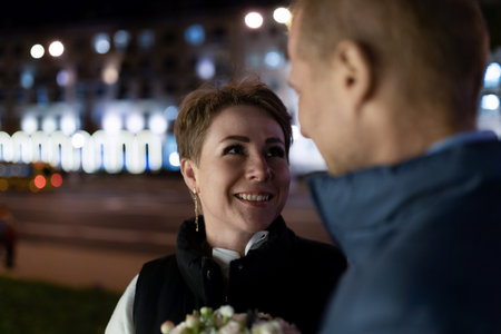 A happy couple walks through the city at night, their faces lit by the warm glow of streetlights