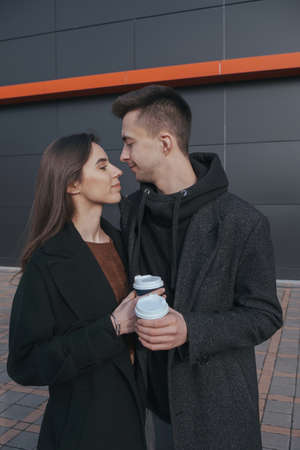 Beautiful and stylish couple walking on a rocky beach. Couple dressed in jackets, hats and boots