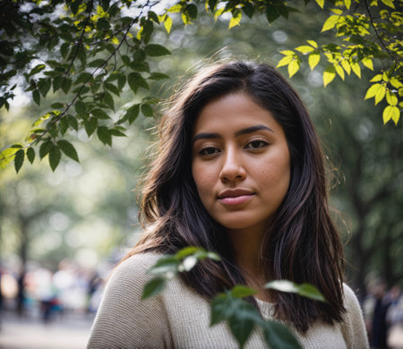 A beautiful young woman captured in natural light, her expression thoughtful and serene. Ideal for illustrating contemplation, beauty, or everyday moments.