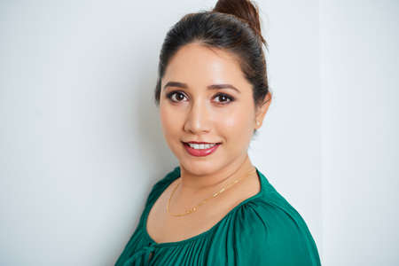 One positive woman portrait against the wall