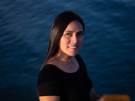 Outdoor portrait of attractive young woman with long black hair