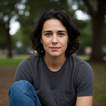 Casual portrait of a woman sitting outdoors with relaxed expression.