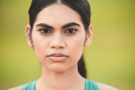 Focused on fitness. Cropped portrait of an attractive young sportswoman standing outside against a green background.