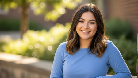 Young adult female smiling outdoors with confidence in casual blue attire.