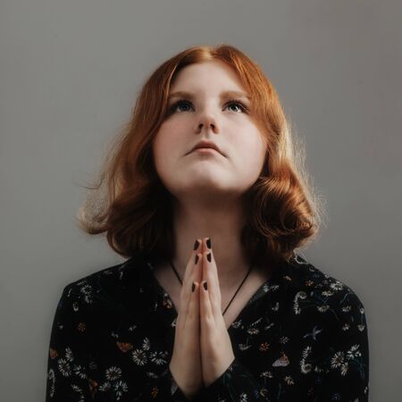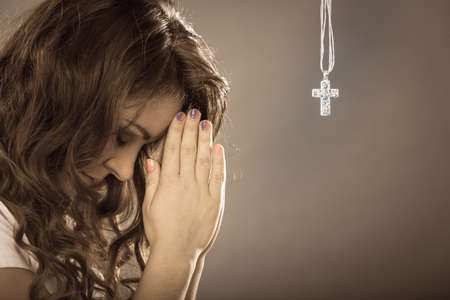 Woman praying to god jesus christ with cross necklace pendant. Strong christian religion faith. Christianity.