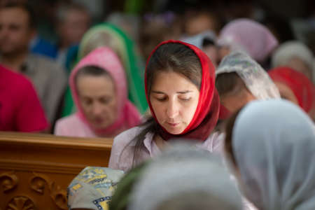 Belarus, the city of Gomil, April 8, 2018. City church. Orthodox Easter.Women in headscarves in a church. Orthodox believer.