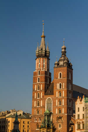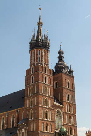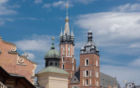 Towers of an Gothic church St. Marys Basilica on the Old Centre of Krakow, Rynek Glowny. Poland old architecture elements.