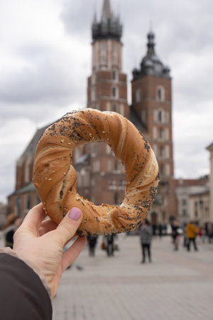 Tourist woman eating bagel obwarzanek traditional polish cuisine snack waling on Market square St. Mary's Basilica on the Krakow Main Square Rynek Glowny Poland. Krakow architecture, old city architecture. Historic Roman Catholic church in Krakow Baroque architecture Travel tourist attraction
