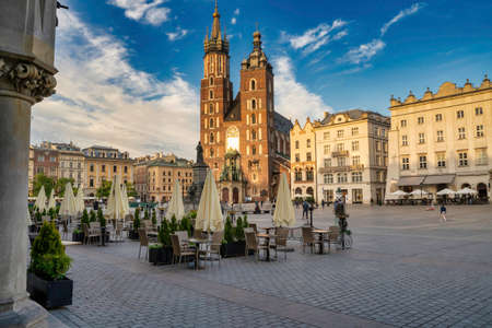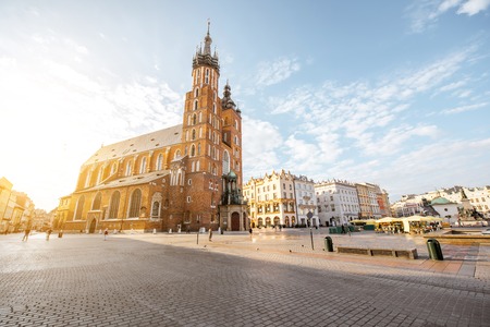 Old city center of Krakow, Poland. Sunrise view with Market square and St. Mary cathedral