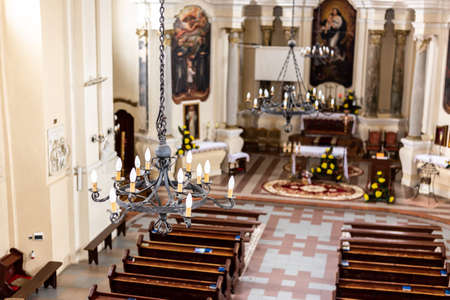 Church of the Assumption of the Virgin Mary and of St. Joseph or Catholic Carmelite Church indoor during the Sunday mass. Warsaw, Poland - October 17, 2021.