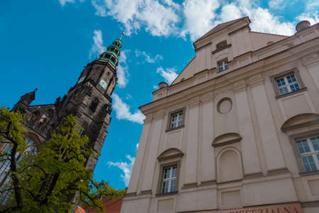 Swidnica Old gothic church rising to the sky. High dark tower and nave completed with bow on blue background and full of clouds of sky.