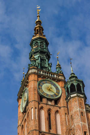 Aerial view from drone on St. Mary Cathedral and City Hall spire clock tower in Gdansk, Poland