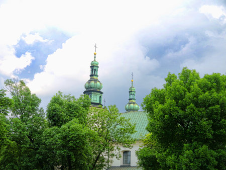 Two old small catholic church towers with crosses on green domes in Krakow, Poland
