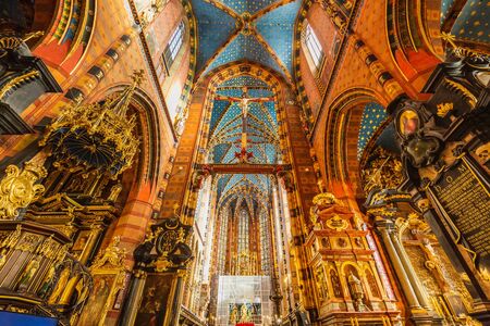 St Mary Basilica Interior in Krakow, Poland. St. Marys Basilica interior, Mariacki Church Gothic and Baroque ornamentation. Krakow, Poland - October 17 2019.