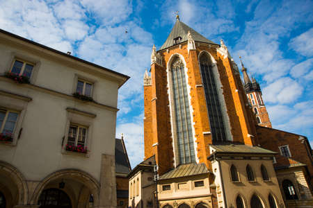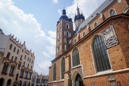 Krakow, Poland - July 26, 2019: Exterior of the Basilica of Saint Mary in the morning.