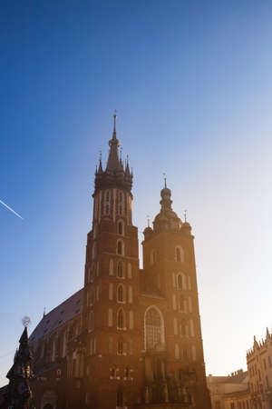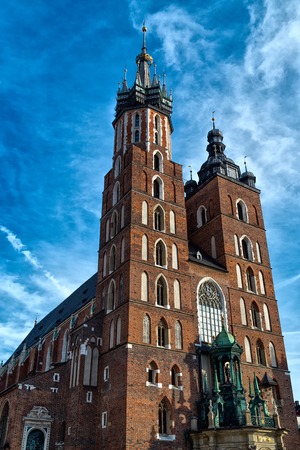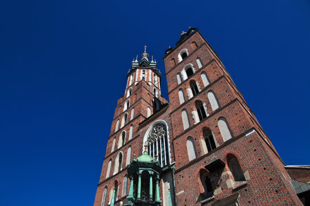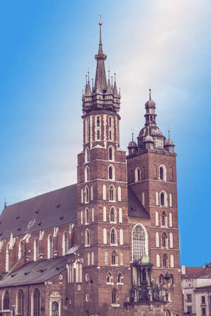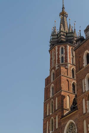 St. Marys Basilica exterior in Main Square in Krakow, Poland. Concept of traveling to Europe and famous brick gothic church, architecture elements.