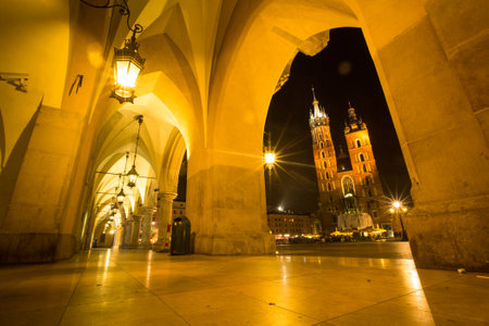 St. Mary's Church on Krakow Market Square in night time.