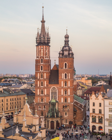 KRAKOW, POLAND - 15TH OCTOBER 2016: A high view towards St. Mary's Basilica on Rynek Glowny (Main Square) at sunset. People can be seen.