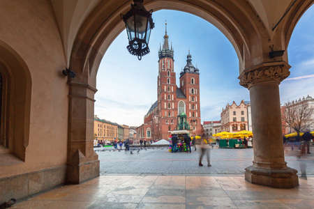 Market square and St. Marys Basilica in Krakow, Poland.