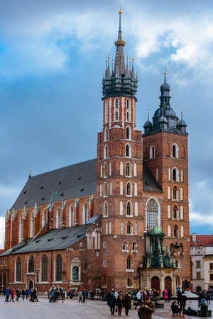 KRAKOW, POLAND - MARCH 7, 2019: Beautiful view of Saint Mary Basilica in the Rynek Główny square of Krakow, Poland