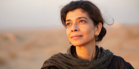 A woman stands in a desert at sunset. She gazes into the distance, with warm light illuminating her face. The landscape is vast and sandy behind her, creating a quiet moment.