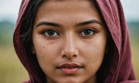 A young woman with dark hair and brown eyes gazes directly at the camera, her face partially hidden by a maroon hood