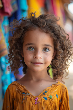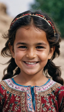A young cute girl 5 years old from Afghanistan in national clothing smiles, showcasing her traditional attire, her expressive eyes reflecting her surroundings and culture. Generative AI.