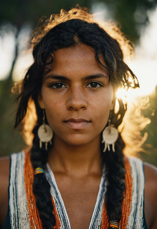This striking portrait features a young Aboriginal Australian woman with braided hair, adorned with traditional earrings, radiating strength amid a setting sun in nature.