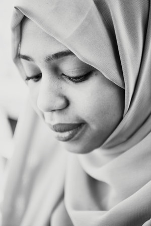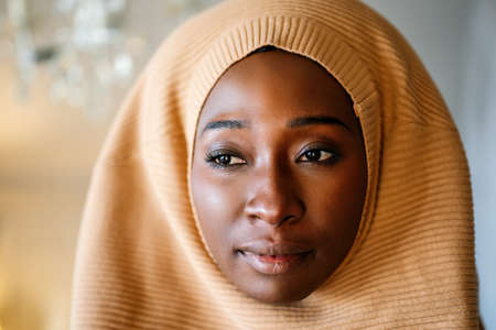 Tranquil portrait of beautiful young black muslim woman wearing hijab