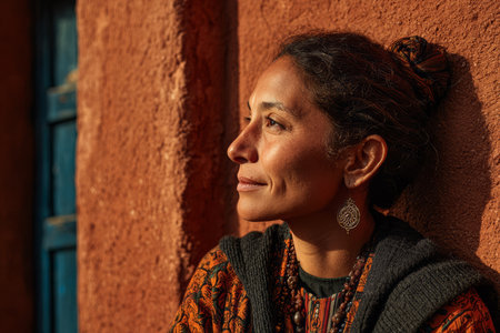 A woman with curly hair and earrings reflects in the afternoon sun. She leans against a rustic wall, showcasing vibrant colors and traditional attire in a serene village setting.