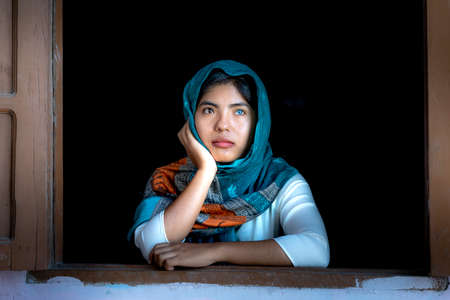 Portrait of a beautiful, elegant and attractive young Malay Asian Muslim woman in a dress and an hijab head scarf.