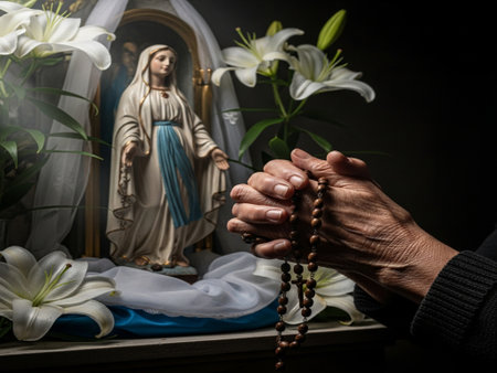 Close-up of Mother of God praying holding rosary