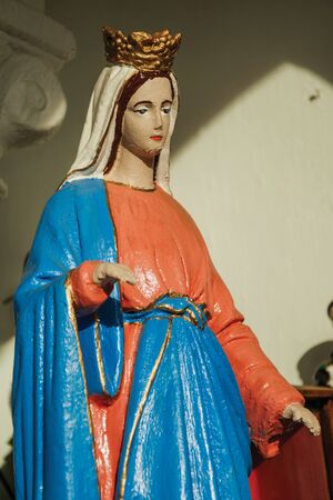 Bento Goncalves, Brazil - July 13, 2019. Detail of Virgin Mary statuette in Naive style made by unknown author in a small shrine near Bento Goncalves. A country town famous for its wine production.