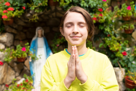 11 year old Catholic boy prays to God in front of a statue of the Virgin Mary