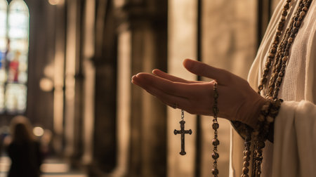 Holding a rosary in quiet contemplation within a historic church during evening light
