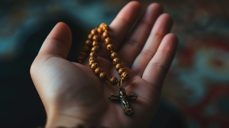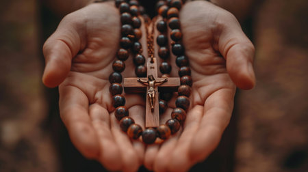 Soulful prayer: a man in quiet devotion, hands clasped around a rosary cross, seeking solace and spiritual connection, capturing the essence of serene contemplation, faith, and religious devotion