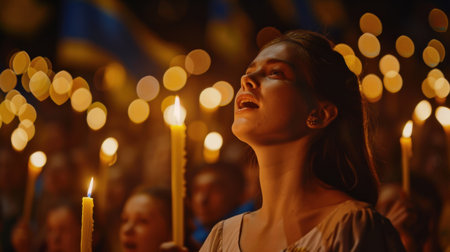 A serene young woman in ornate attire raises her hands in prayer, illuminated against a golden backdrop during a spiritual moment