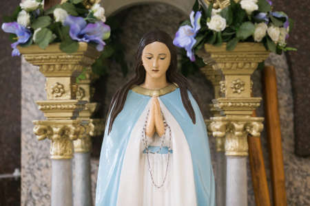 Mother Mary pray. Blessed virgin statue. Rosary in hands.