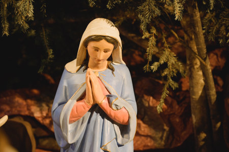 Close-up of the figurine of the Virgin Mary, praying with her hands clasped in the Christmas nativity scene