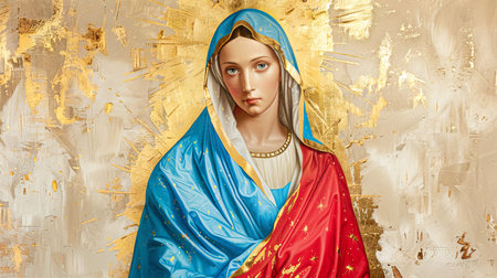 Oil painting Icon of the Virgin Mary in a blue and red robe with a golden halo. Concept of religious art, spiritual iconography, sacred symbolism, classical painting.