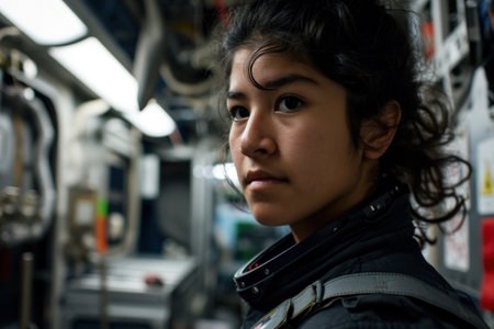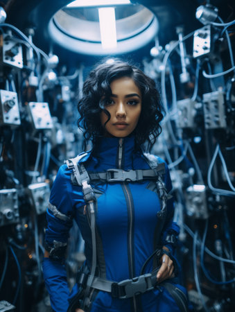 Beautiful young woman boasts a gentle smile, dressed in a pink jacket inside a spacecraft, reflecting a fusion of charm and futuristic adventure.
