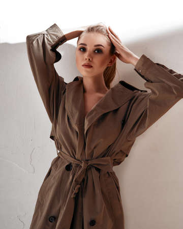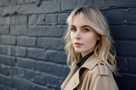 Portrait of a fashionable young woman in a trench coat with a dark brick wall backdrop